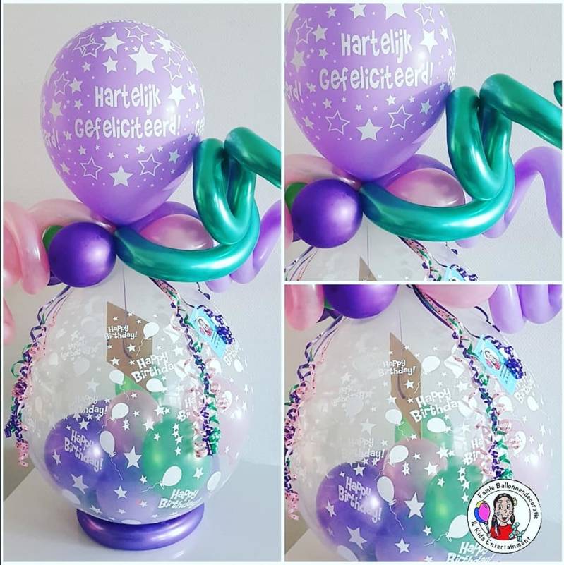 De ballon cadeau is een grote ballon die helemaal naar uw wens wordt samengesteld met uw cadeau. In de ballon cadeau zitten kleine ballonnen en confetti en als top versiering voor de ballon cadeau zijn er veel mogelijke keuzes...zoals een mooie folieballon, een bedrukte ballon of een door onze ballonnenartiest zelfgemaakte en gepesonaliseerd ballonfiguur. In de ballon cadeau kan je geld erin doen,maar het is ook mogelijke om niet te groot of zware cadeaus in te doen. Denk hierbij aan bijvoorbeeld een leuk knuffel, een kleine 20cl flesje wijn/champagne, bonbons, een mooie blouse, baby kleding, baby bad spullen, een mooie kaartje... de maximale gewicht van het cadeau mag 400gram zijn en het cadeau mag geen scherpen randen of kanten bevatten. De maximale doorsnede van de nek van de ballon is 13 cm.